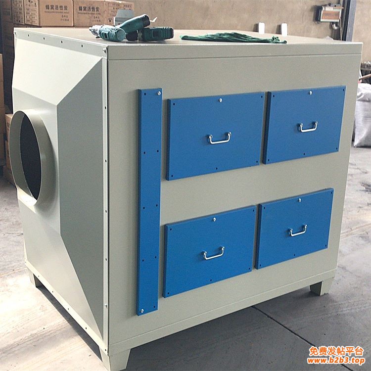 使废气与大表面的多孔性活性炭吸附剂相接触,废气中的污染物被吸附在活性炭表面上,使其与气体混合物分离,净化后的气体高空排放。活性炭环保箱是一种干式废气处理设备